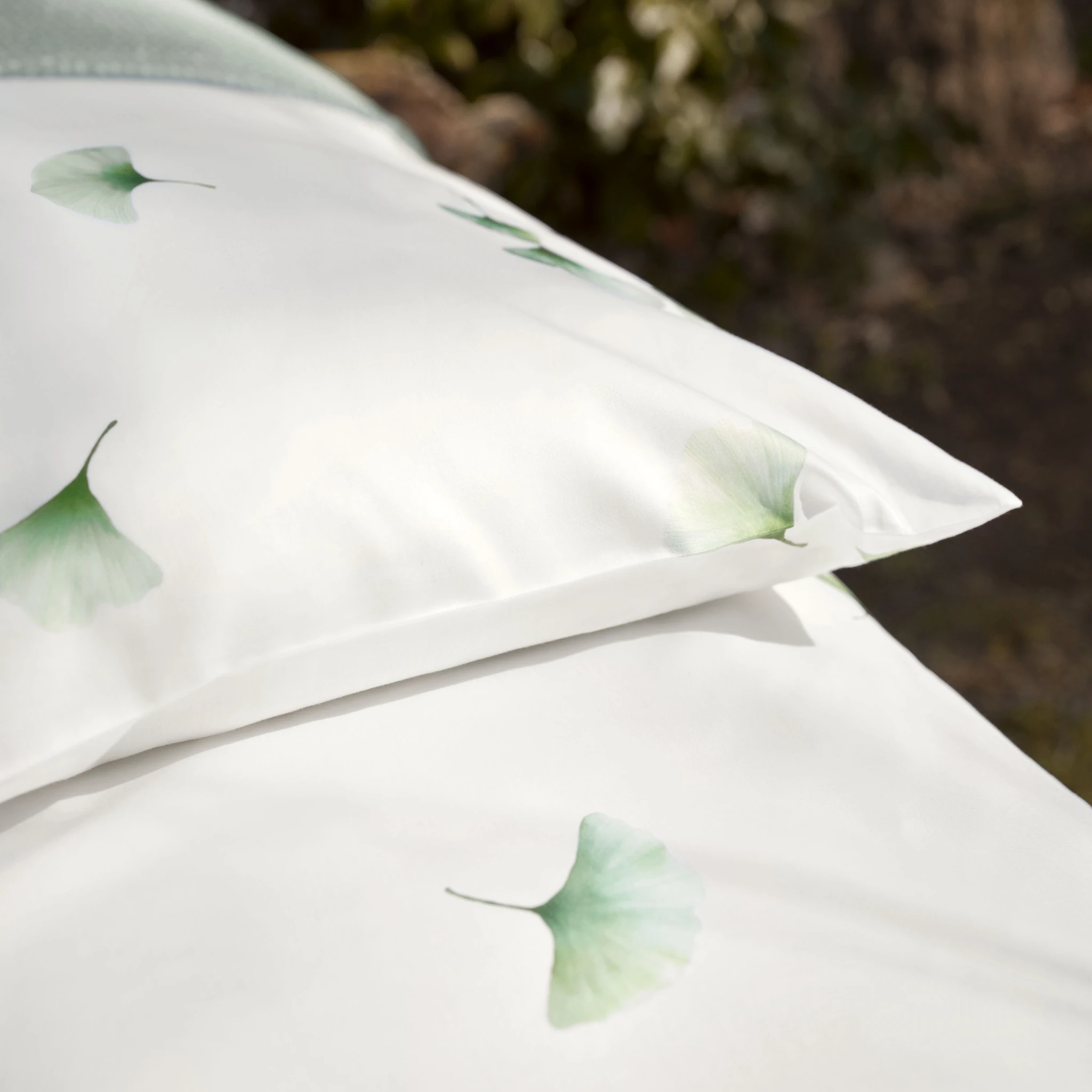 Auf der Schlossberg Bettwäsche AIKO schweben feine Ginkgo-Blätter in sanft abgestuften Grüntönen über makellos weißen Satin – als würden sie von einer leichten Brise getragen. Die in Aquarell angelegte Darstellung sorgt für eine zarte Transparenz; weiche Farbverläufe und die filigranen Blattadern verleihen dem Motiv Tiefe und eine natürlich wirkende Leichtigkeit. Das zurückhaltende Design bringt eine ruhige, fast meditative Atmosphäre ins Schlafzimmer – inspiriert von der Stille eines Zen-Gartens.