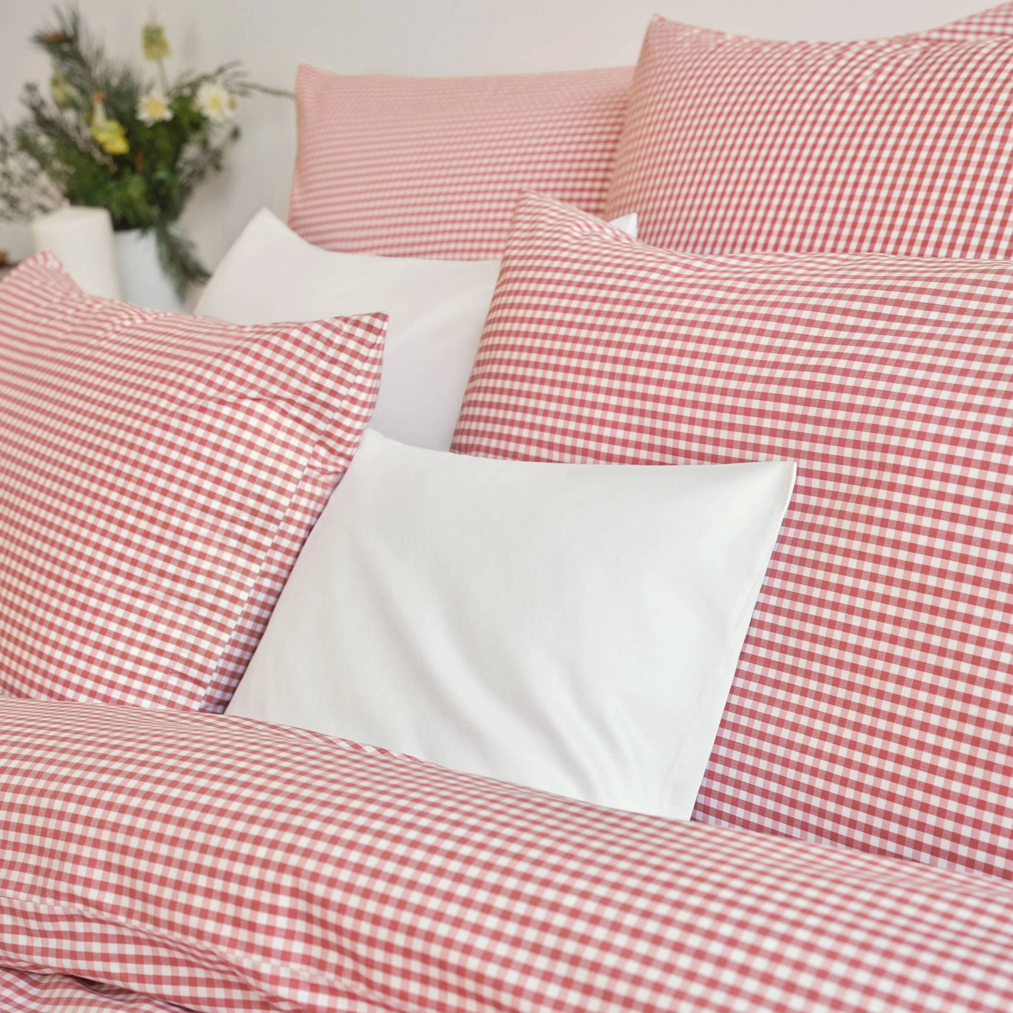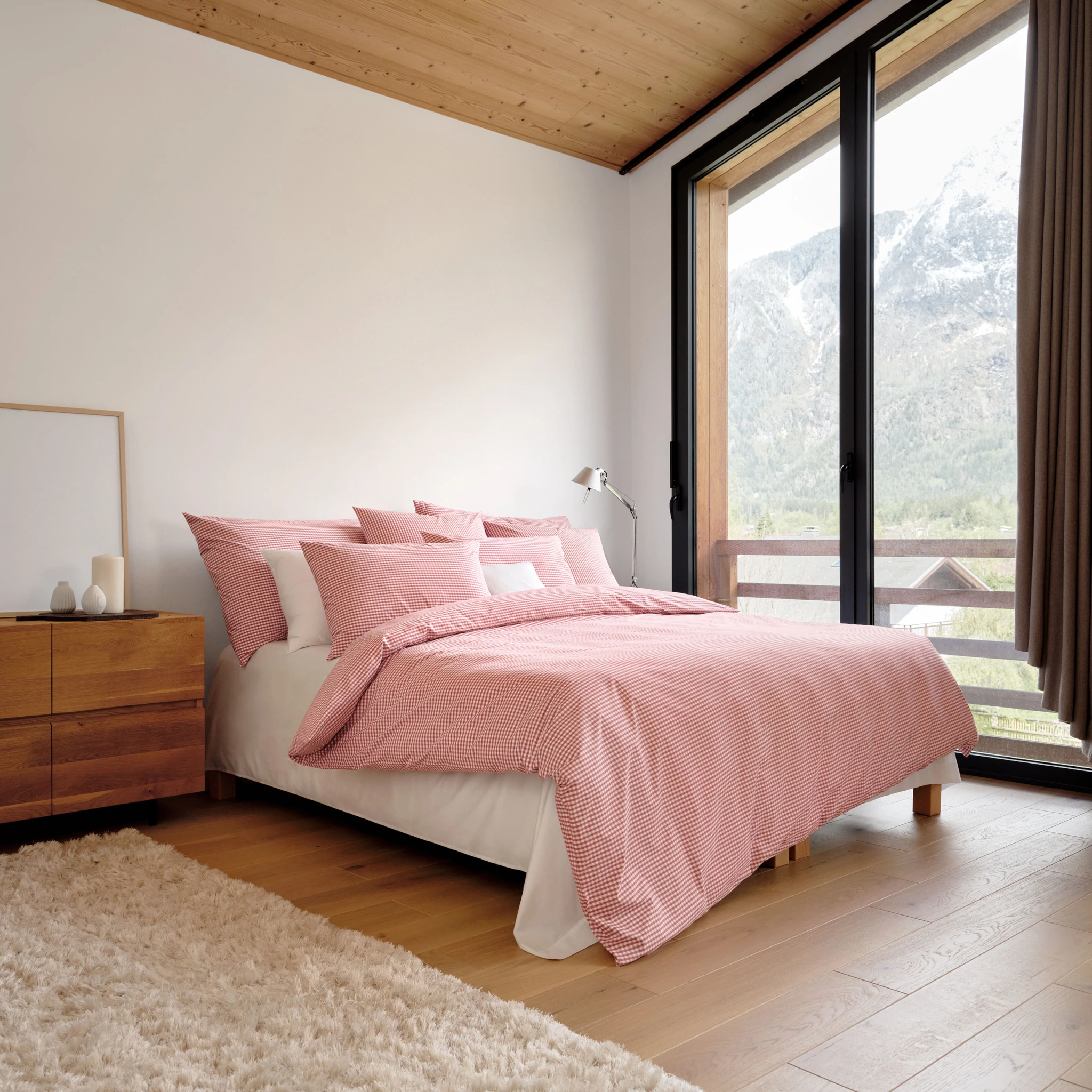 Die Schlossberg Bettwäsche Andrin ist eine wahre Hommage an die Schönheit der Tradition und die Liebe zu den Alpen. Sie präsentiert sich als zeitloses, buntgewobenes Vichy-Karo, das den Charme klassischer Designs mit einem modernen Twist vereint. In den Farben Beige, Bleu, Rouge und Vert entsteht ein kontrastreiches, zweifarbiges Blockmuster, das durch seine matte Oberfläche und zeitgenössisches Flair besticht.