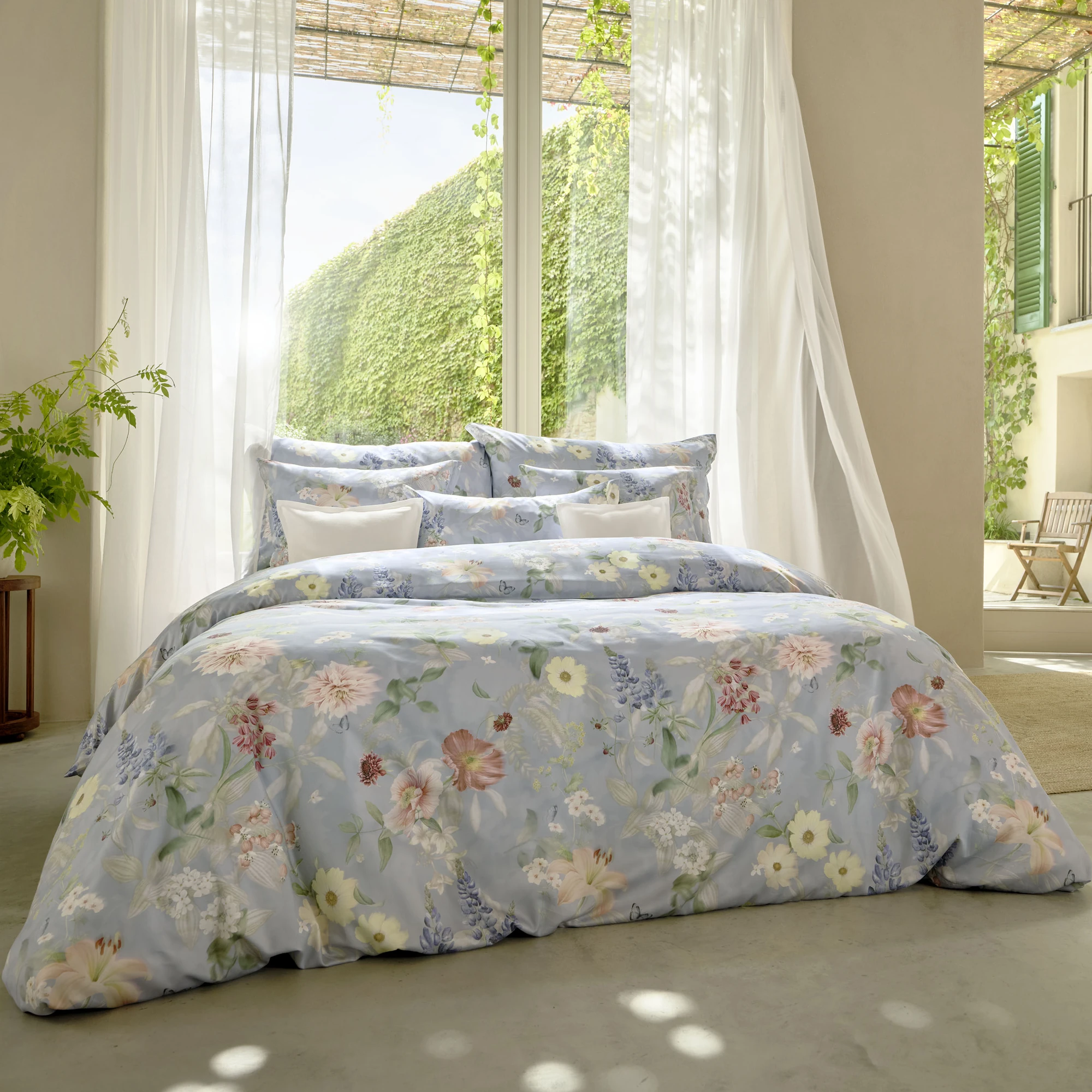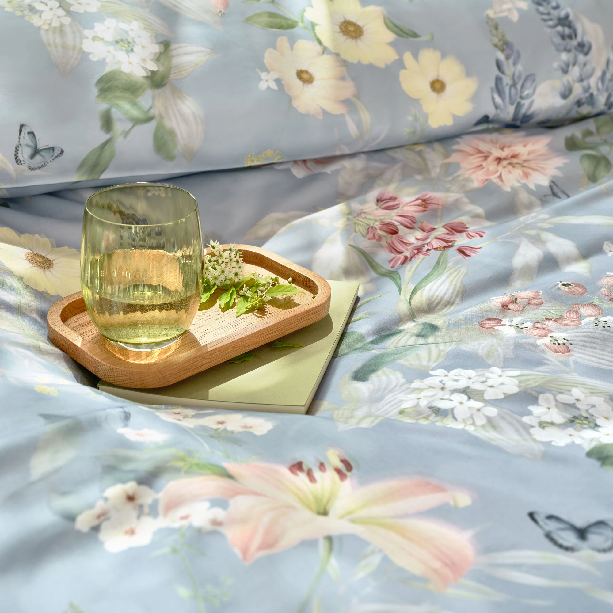 Die Schlossberg Bettwäsche Aven ist eine Hommage an die Leichtigkeit eines sommerlichen Gartens im Wind. Das Design besticht durch eine kunstvolle Symbiose aus detailreichen Bleistiftzeichnungen und fließenden Aquarell-Elementen. Auf einem edlen Fond in Rauchblau entfaltet sich ein lebendiges Zusammenspiel aus Dahlien, Mohn, Lilien und Frauenmantel, das von zarten Schmetterlingen begleitet wird. Ein dezentes, flächiges Muster im Hintergrund verleiht dem Motiv eine faszinierende Tiefe, während die Farben zwischen kühlem Blau und warmen Akzenten in Rostrot und Vanillegelb harmonisch verschmelzen.