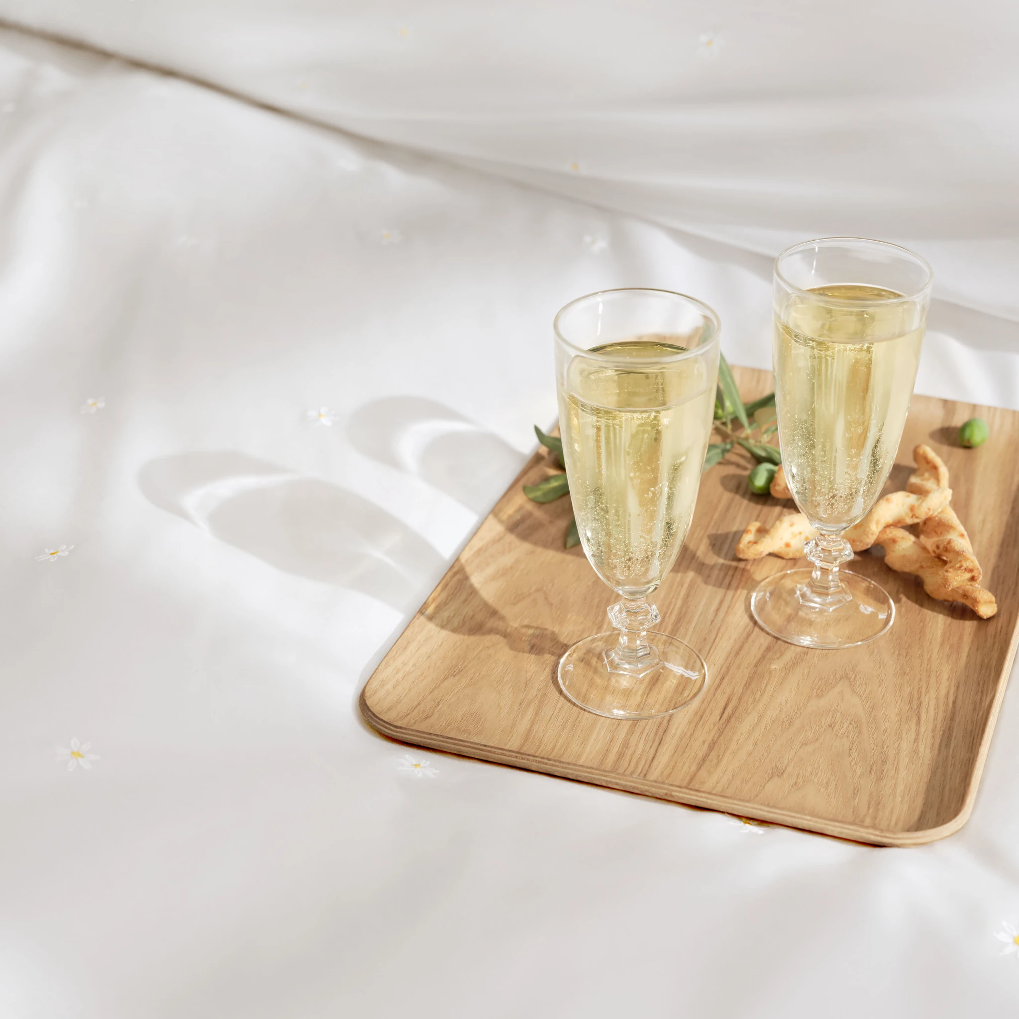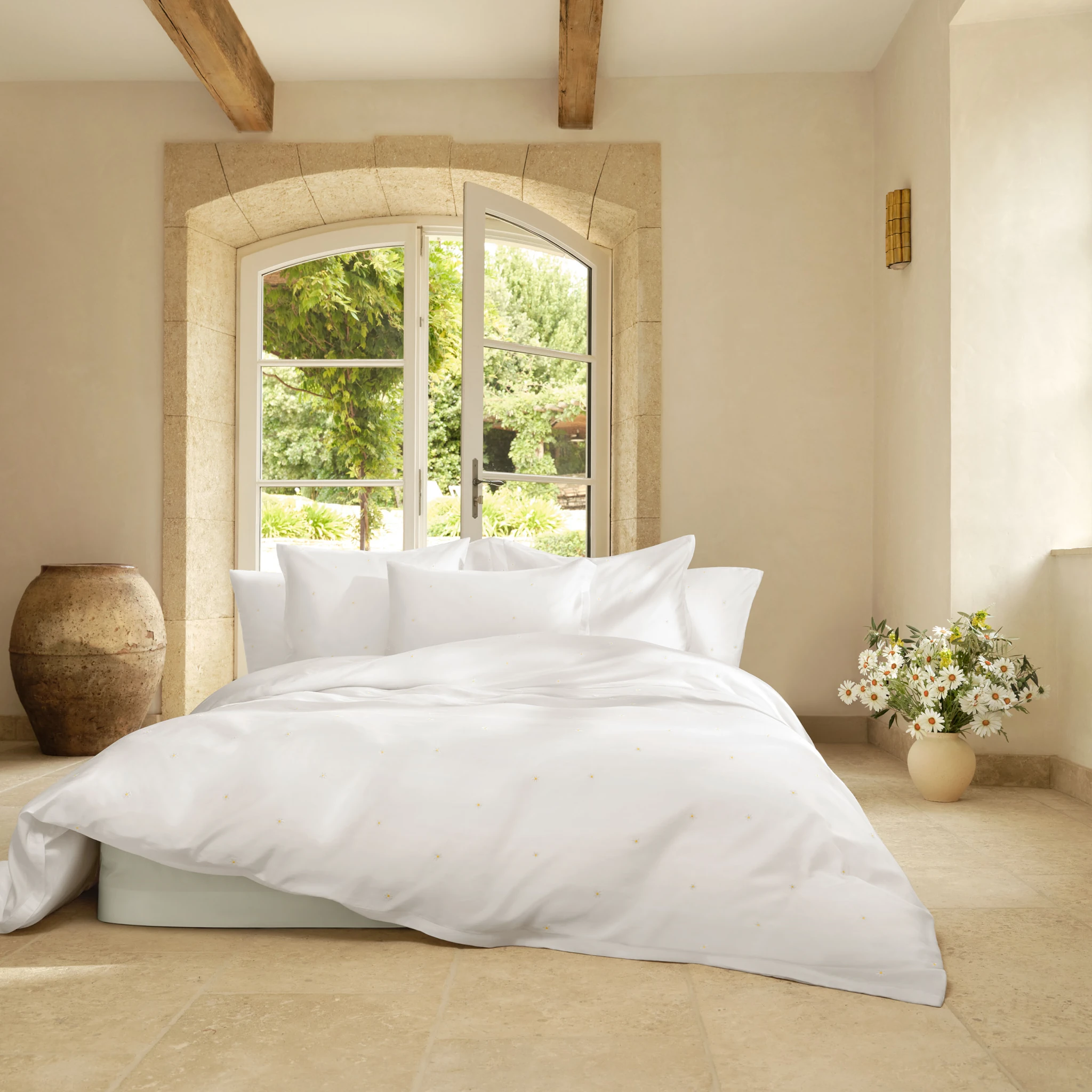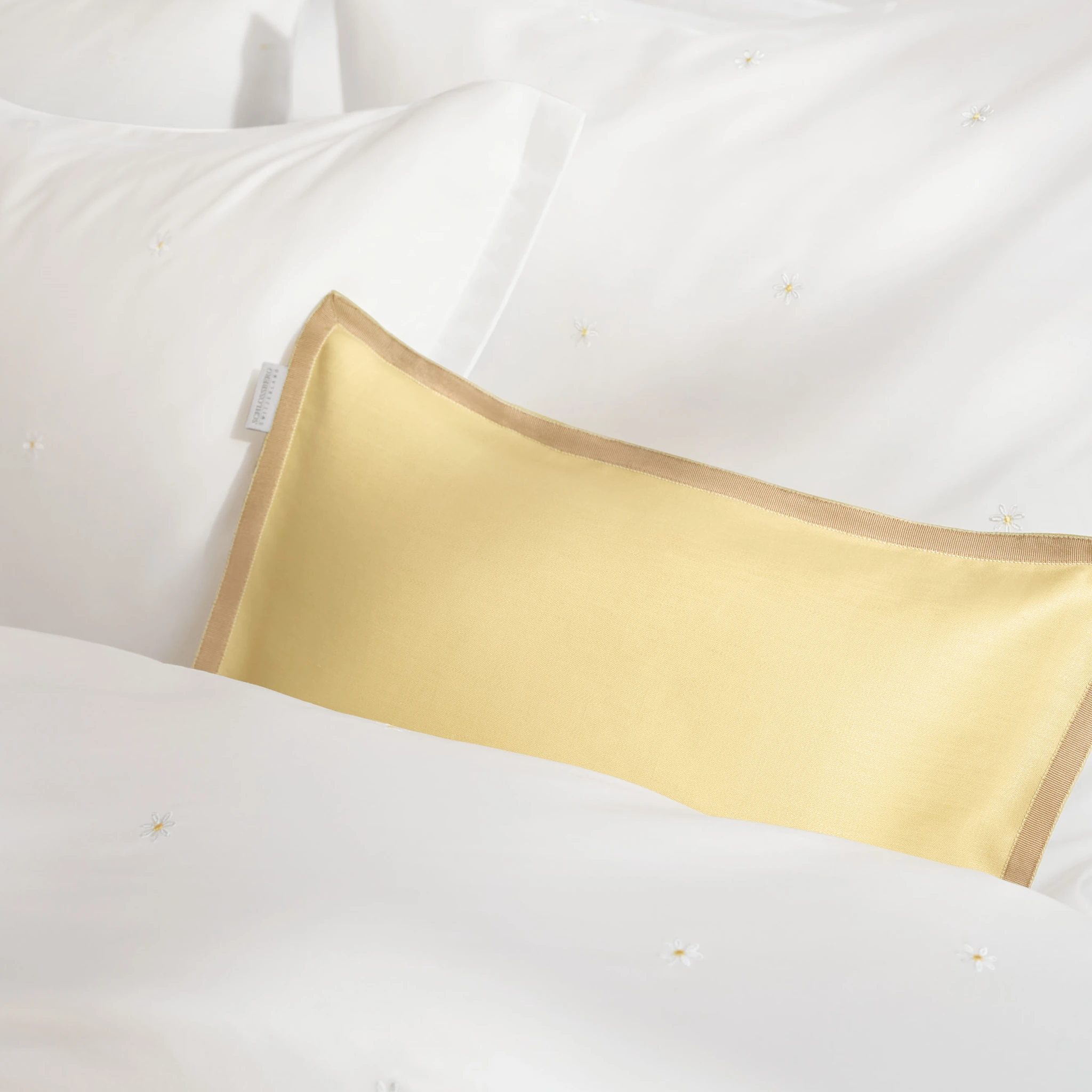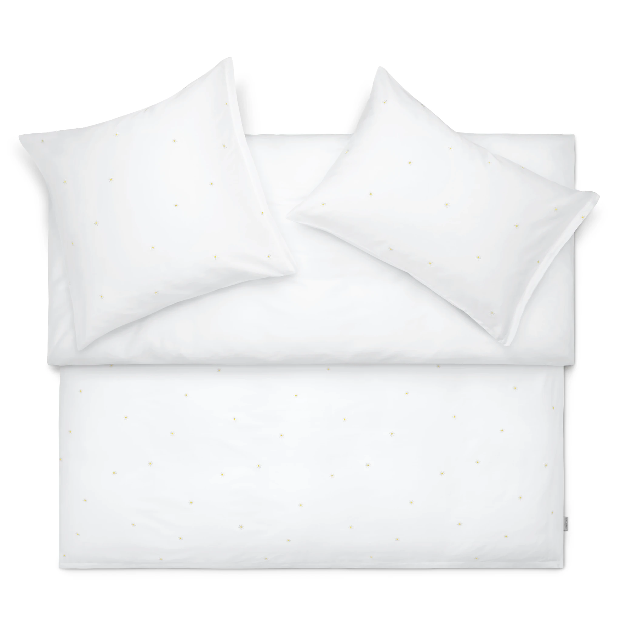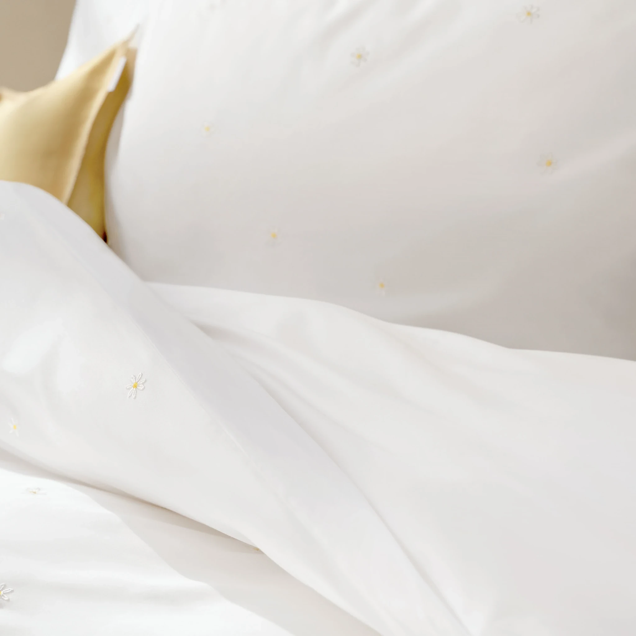 Wenn die heimische Gartenwiese und das eigene Schlafzimmer Erinnerungen an zarte Gänseblümchen und sommerliche Leichtigkeit wecken, verzaubert die Schlossberg Bettwäsche Daisy mit einem besonders filigranen Design. Kleine, aufgestickte Gänseblümchen tanzen zierlich und erhaben auf der Bettwäsche-Oberseite und verleihen dem reinweißen Satin eine charmante Eleganz.