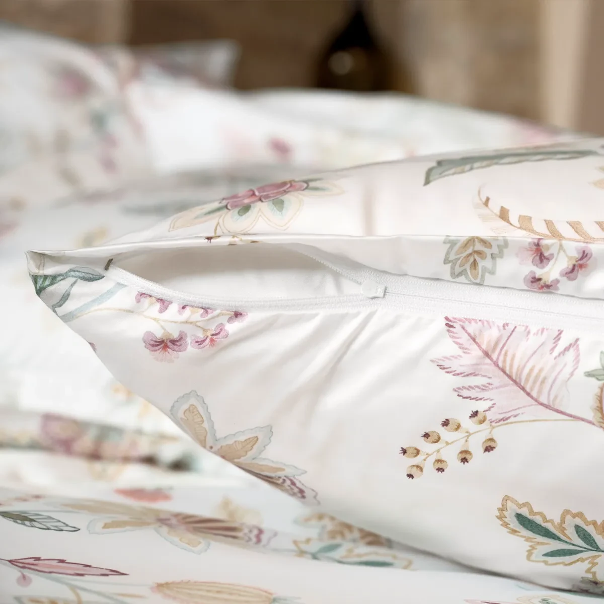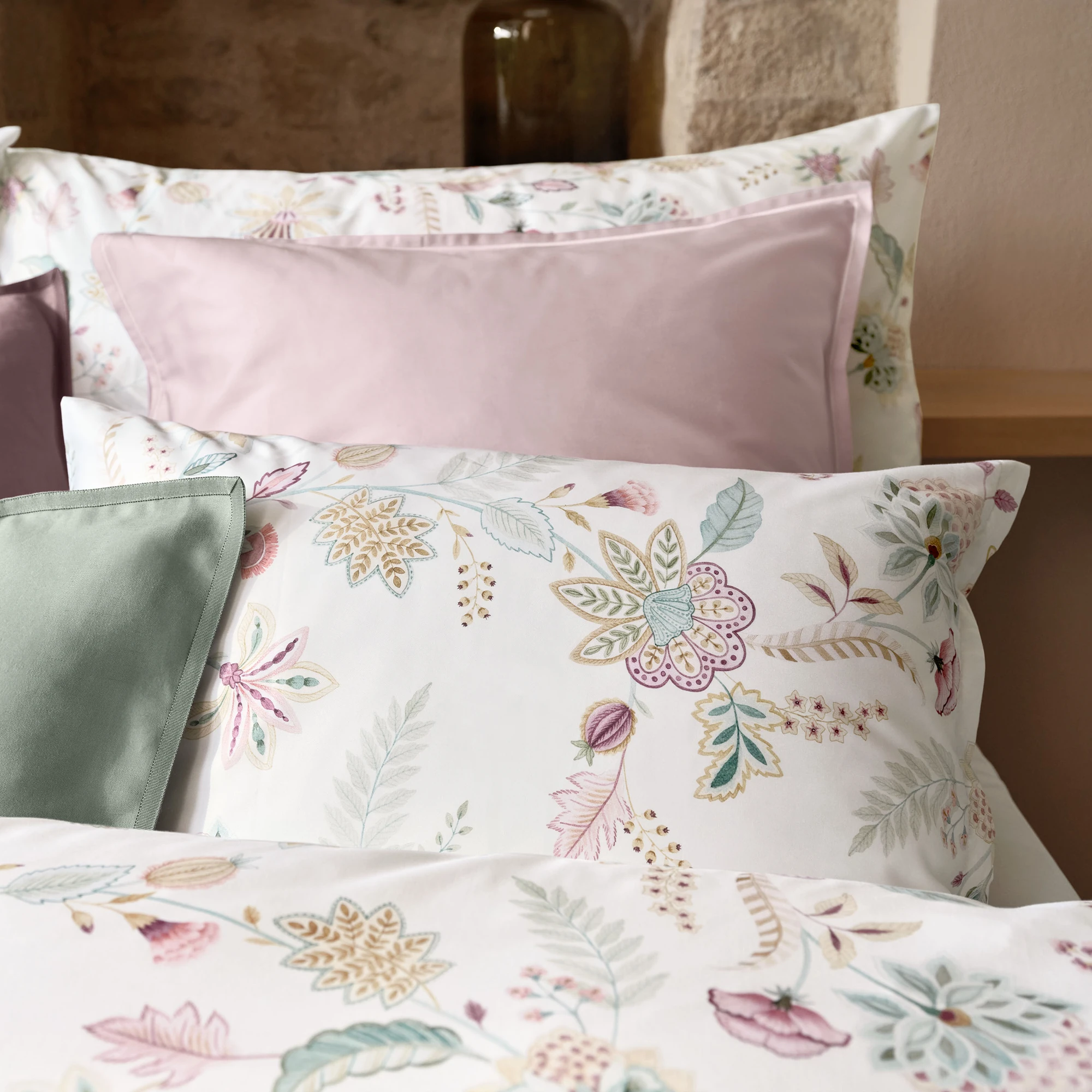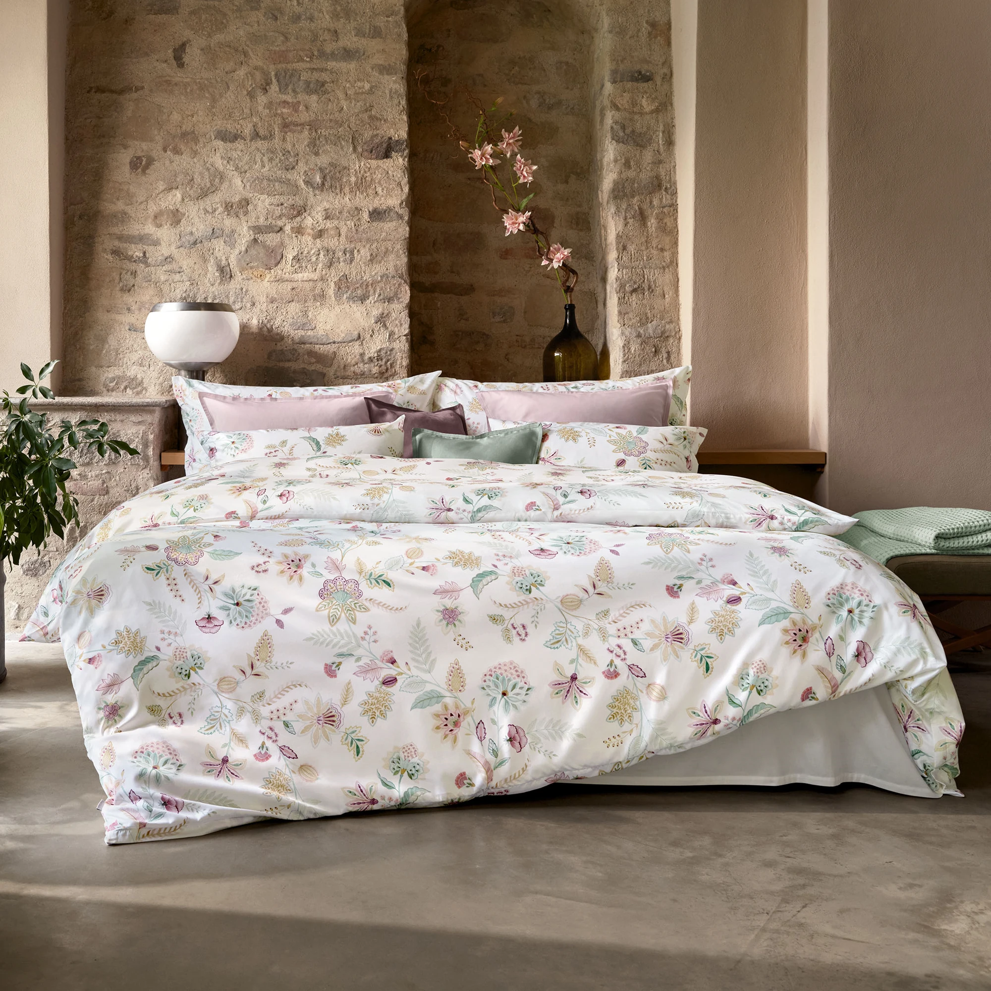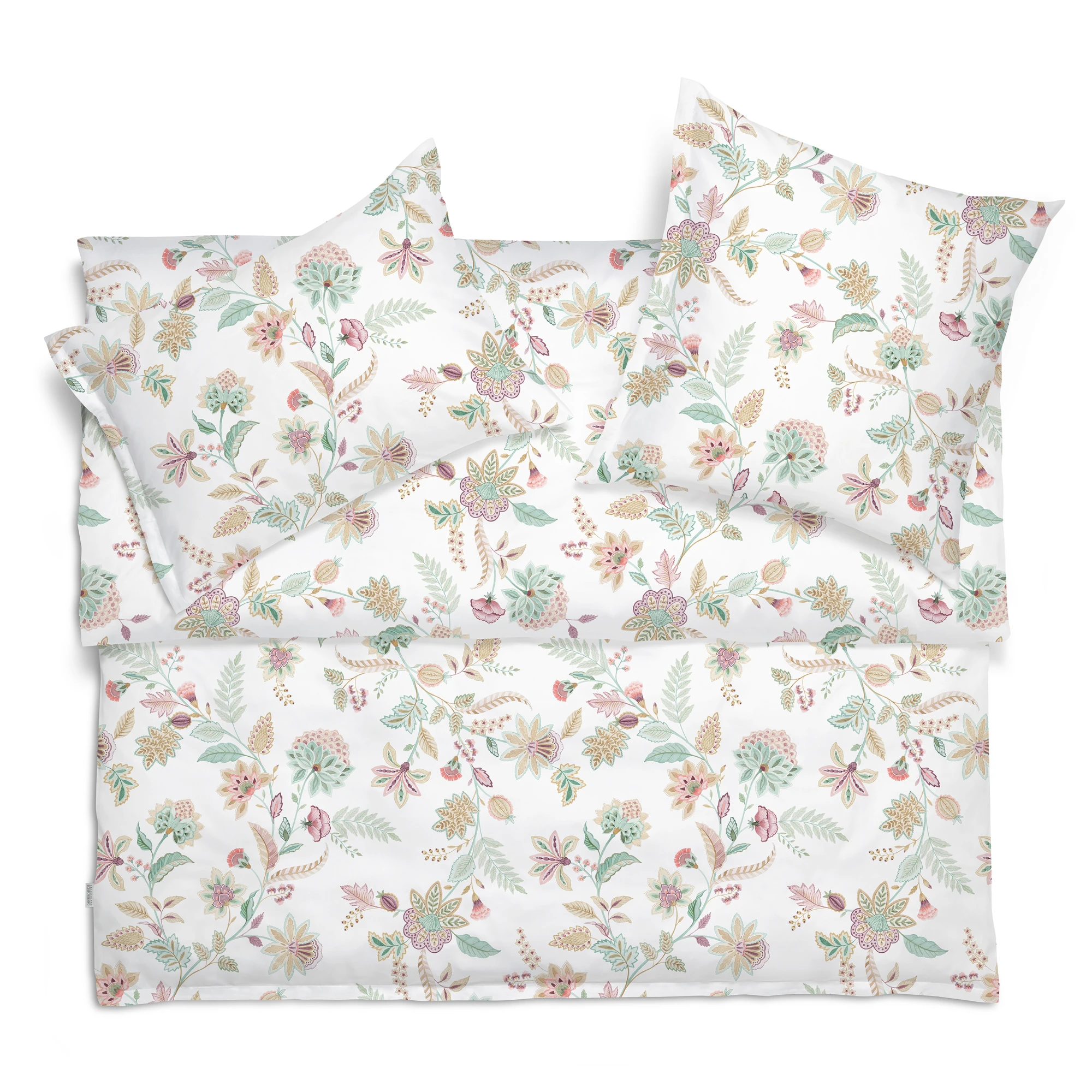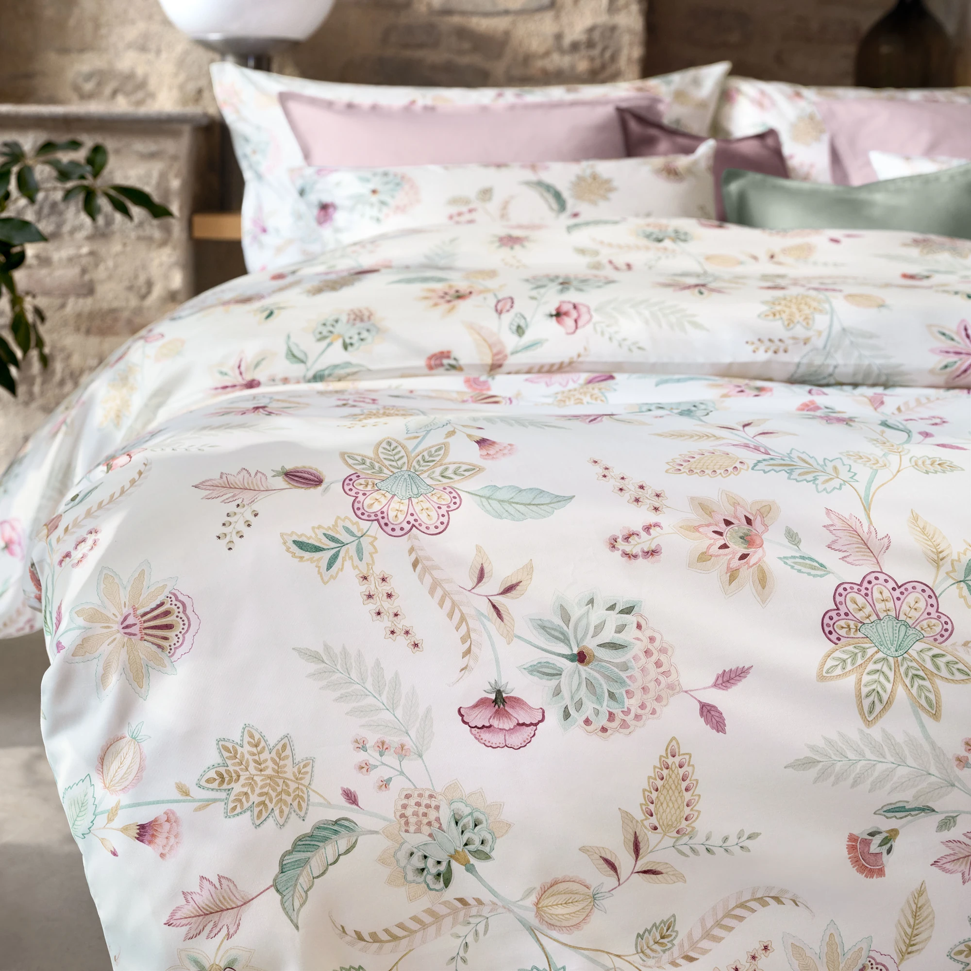 Die Schlossberg Bettwäsche Ima entführt Sie in eine Welt voller Eleganz und fernöstlicher Inspiration. Das Design ist eine moderne Interpretation klassischer Ornamentik, die mit filigraner Leichtigkeit an die kunstvolle Ästhetik des Orients erinnert. Auf einem strahlenden, blütenweißen Fond ranken sich stilisierte Blüten und Blätter in einer fließenden Bewegung über das feine Maschenbild und schaffen eine Atmosphäre von Ruhe und zeitloser Schönheit.