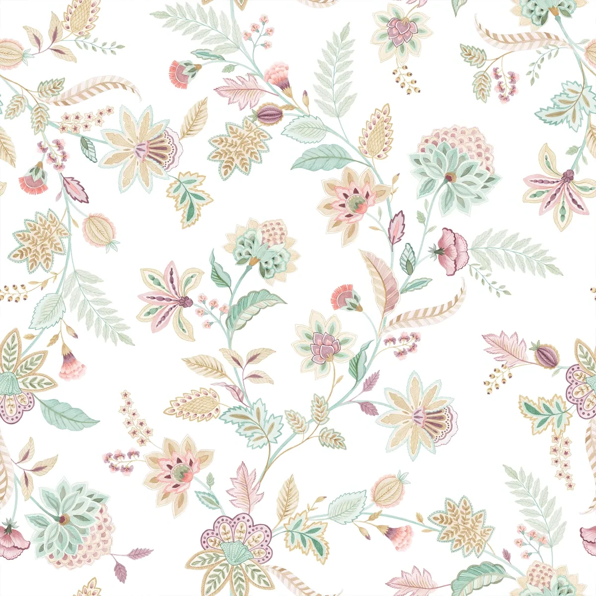 Das künstlerische Arrangement besticht durch seine handgemalte Optik, die durch die Kombination von sanften Aquarellverläufen und präzisen Buntstiftzeichnungen entstanden ist. Die gedeckte Farbstimmung harmoniert perfekt mit modernen Interieurs: Edles Salbeigrün, warmes Sandbeige und pudriges Aubergine treffen auf einen frischen Akzent in Koralle, der dem Design eine lebendige und zugleich luxuriöse Note verleiht.