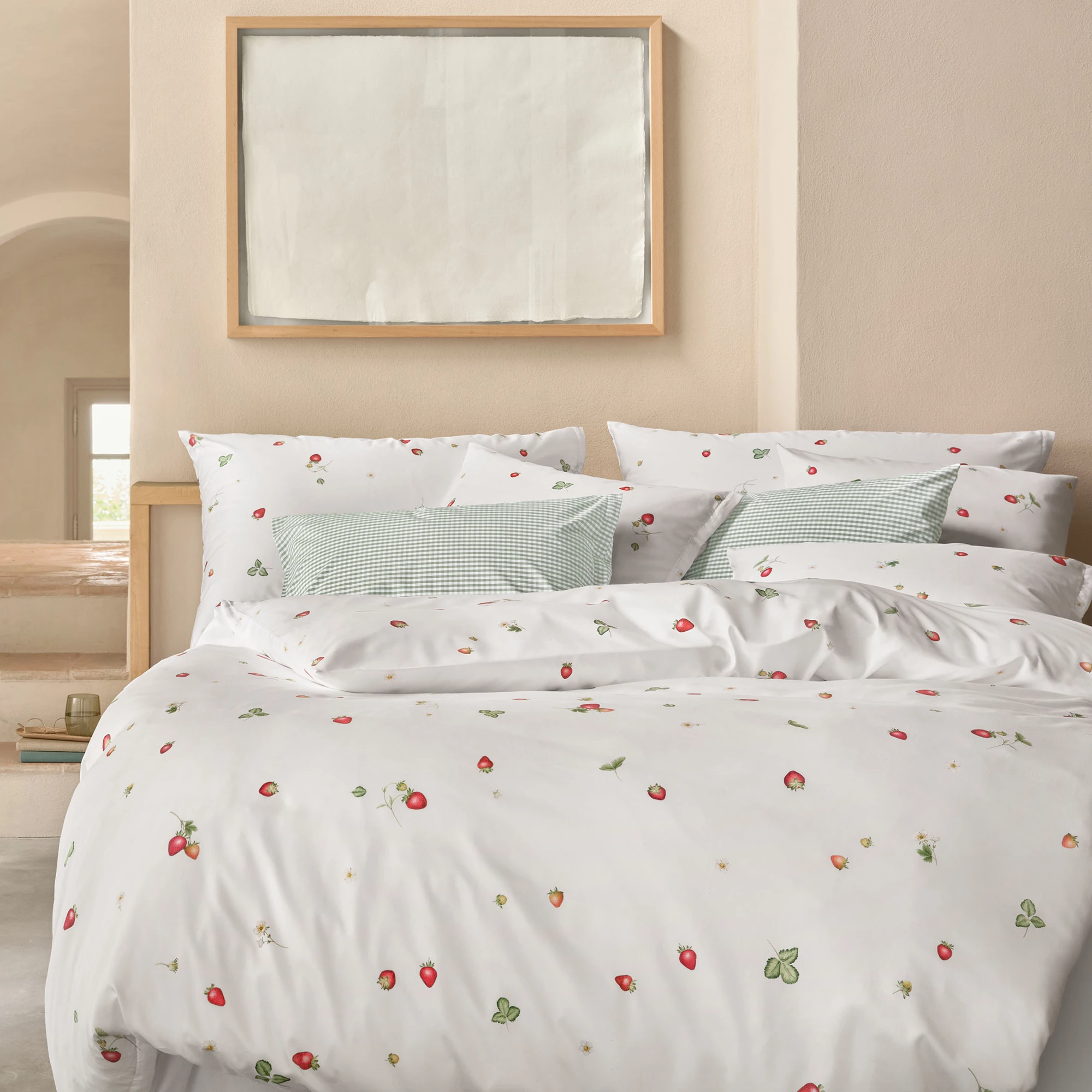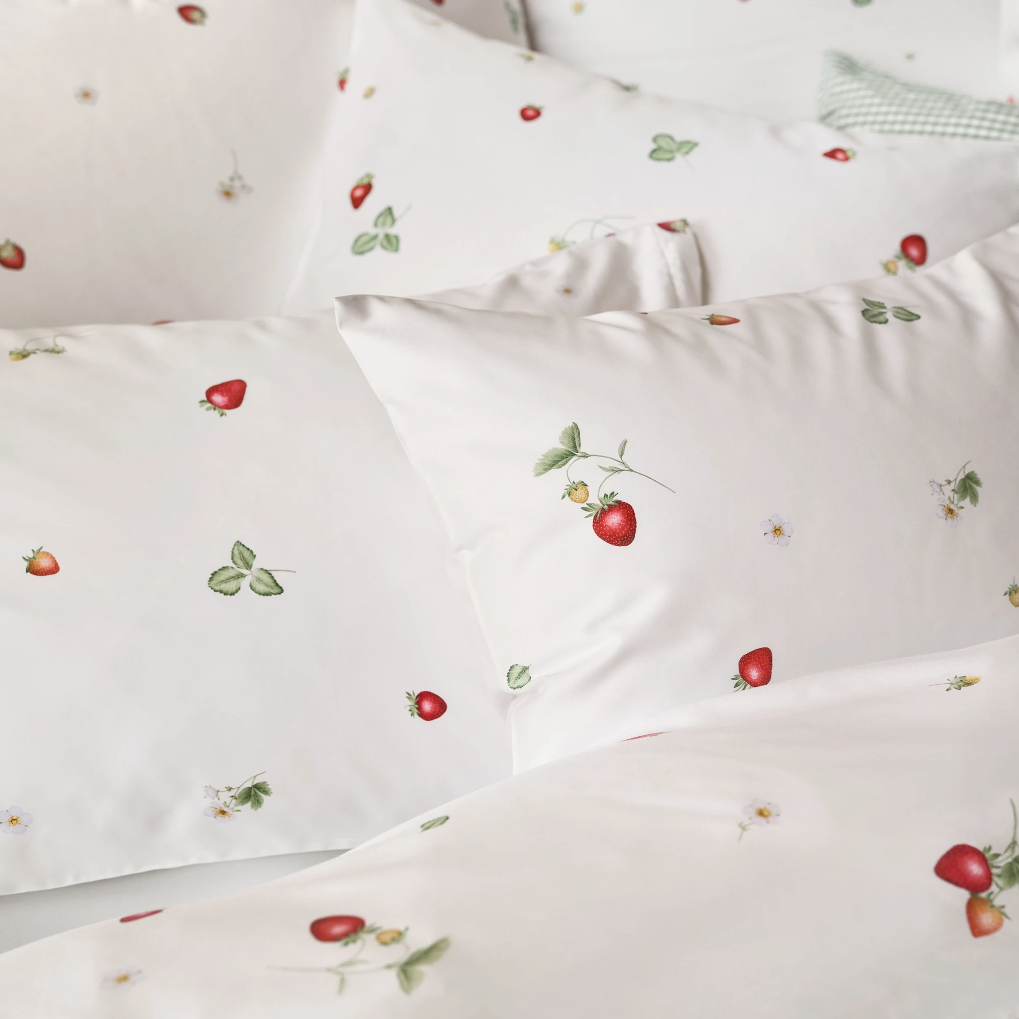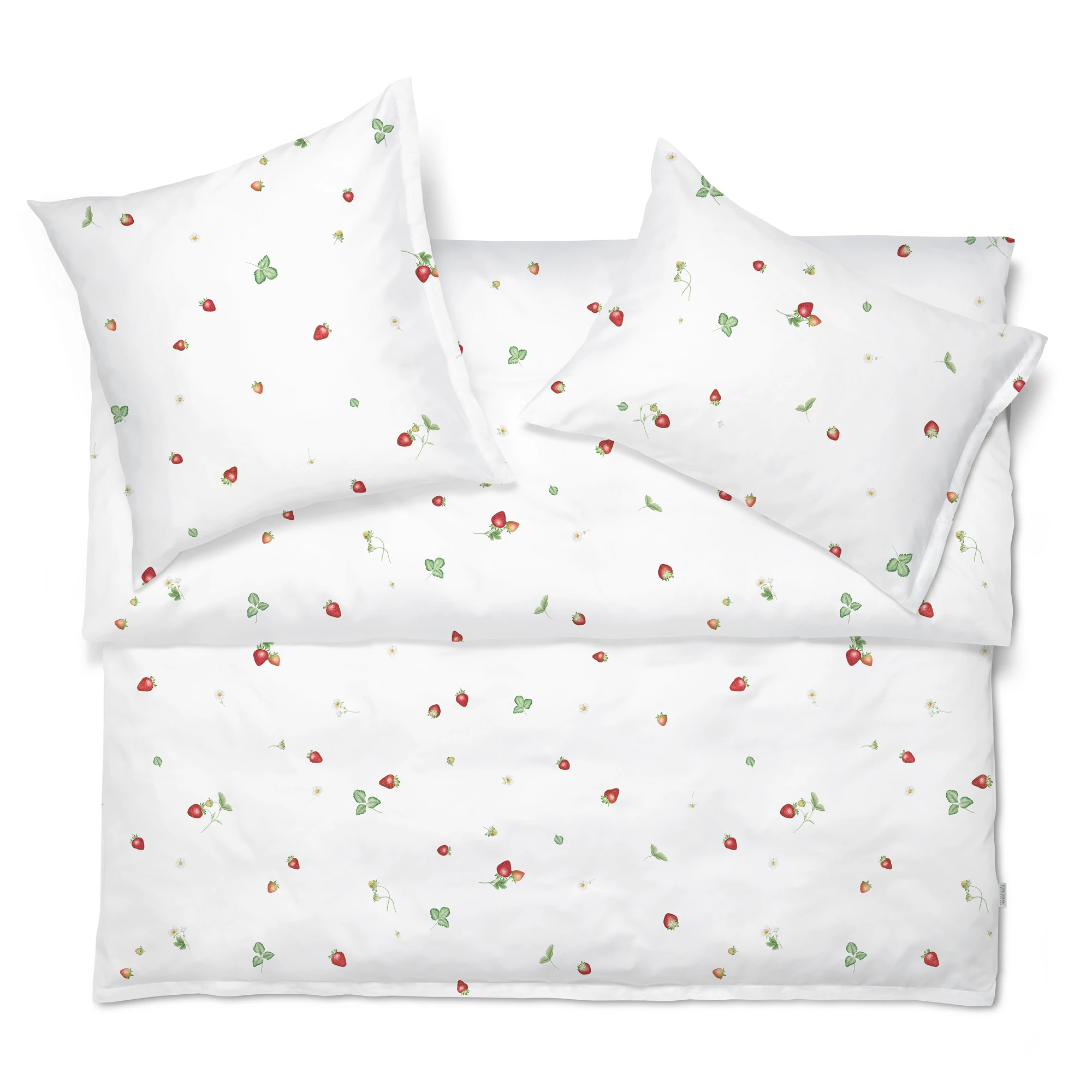 Die Schlossberg Bettwäsche June ist der Inbegriff des Sommers und fängt die unbeschwerte Magie eines warmen Junitages perfekt ein. Das Design zelebriert die Erdbeere in all ihrer Pracht – von der zarten, weißen Blüte bis hin zur tiefroten, sonnengereiften Frucht. Wie ein Spaziergang durch einen heimischen Garten am Sommeranfang versprüht dieses Motiv Frische, Lebensfreude und eine natürliche Leichtigkeit, die Ihr Schlafzimmer in eine sommerliche Oase verwandelt.