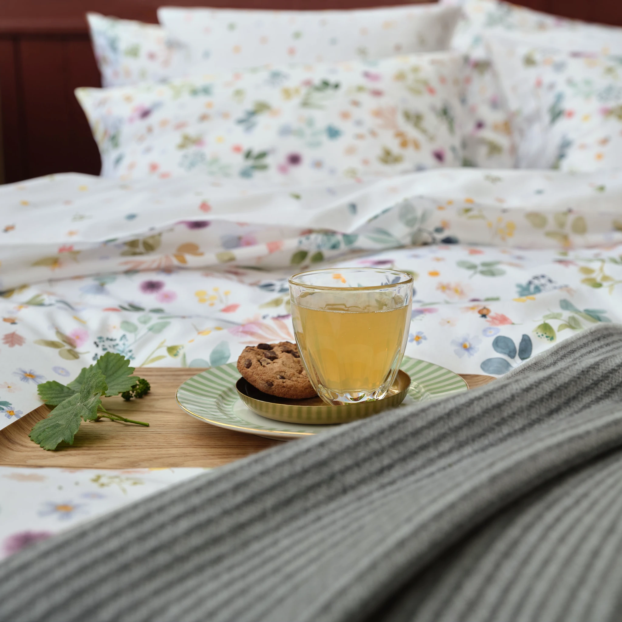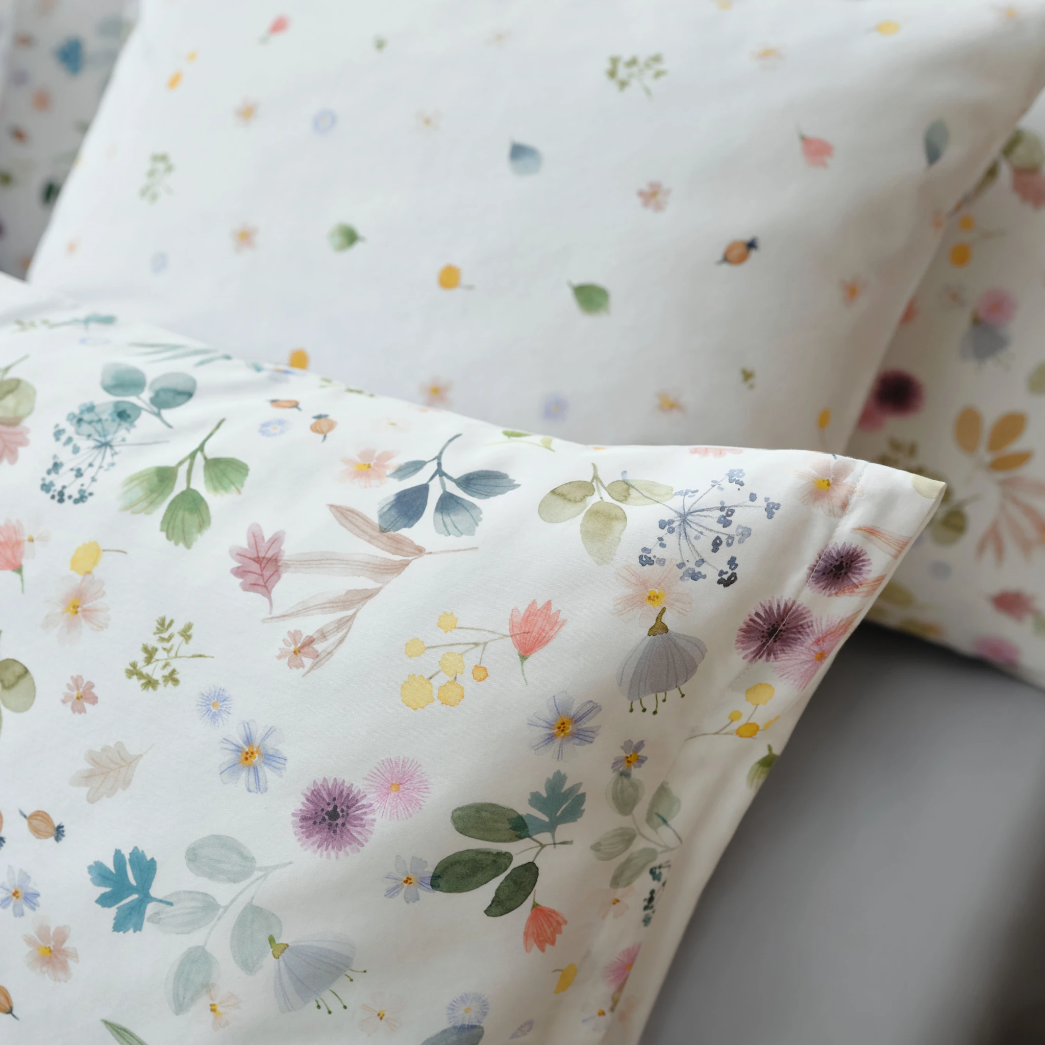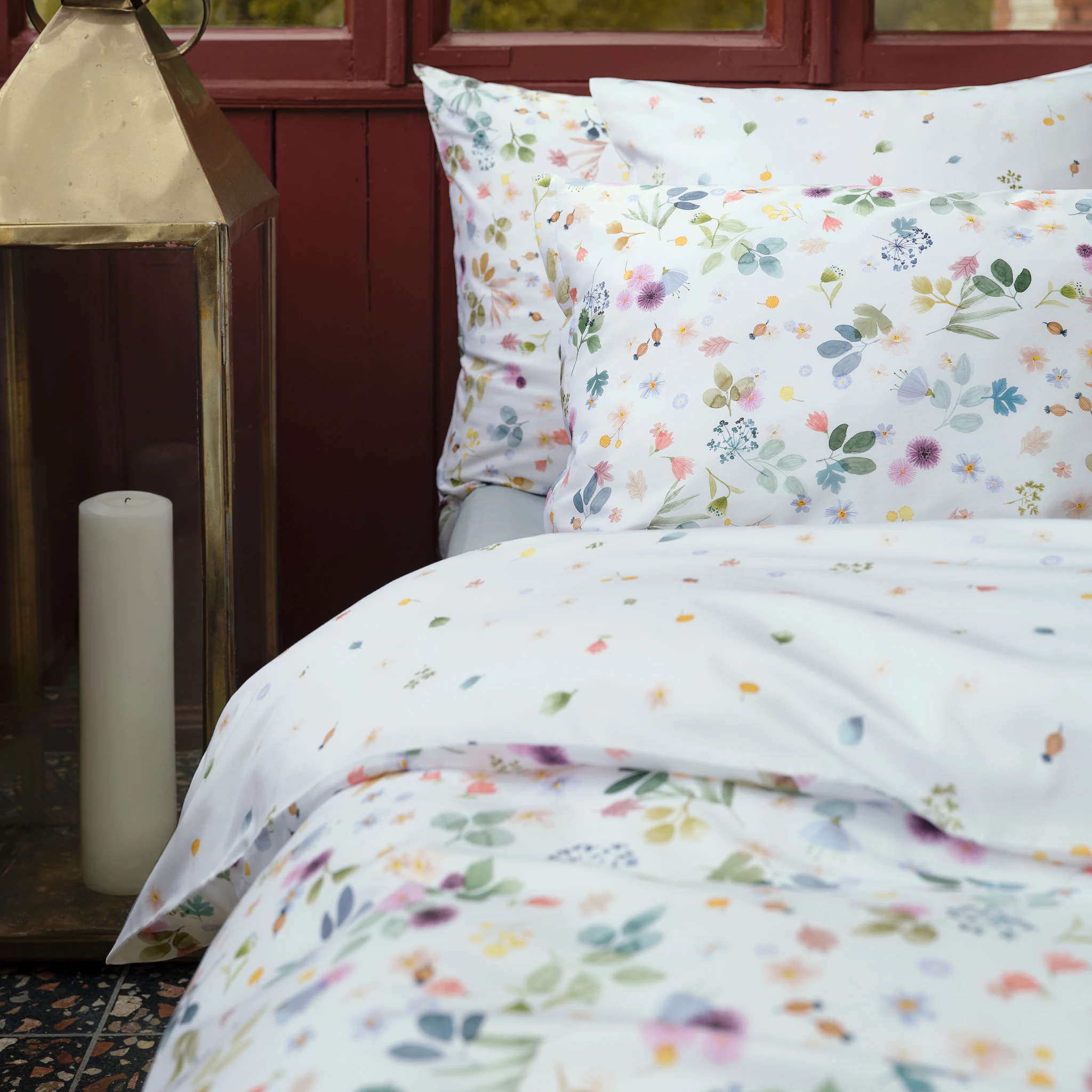 Im ersten Moment scheint der feine Strauß aus Blüten und Blättern zufällig über den reinweißen Satin der Schlossberg Bettwäsche Ylvie gestreut, doch bei jedem Windstoß entfaltet sich ein herbstlicher Reigen, der an die Leichtigkeit des Spätsommers erinnert. Die verspielte Wende-Bettwäsche Schlossberg Bettwäsche Ylvie ist sowohl der Fantasie als auch der Natur entsprungen und zeigt sich mit Motiven von Astern, Eichenblättern, Hagebutten und Kümmel.
