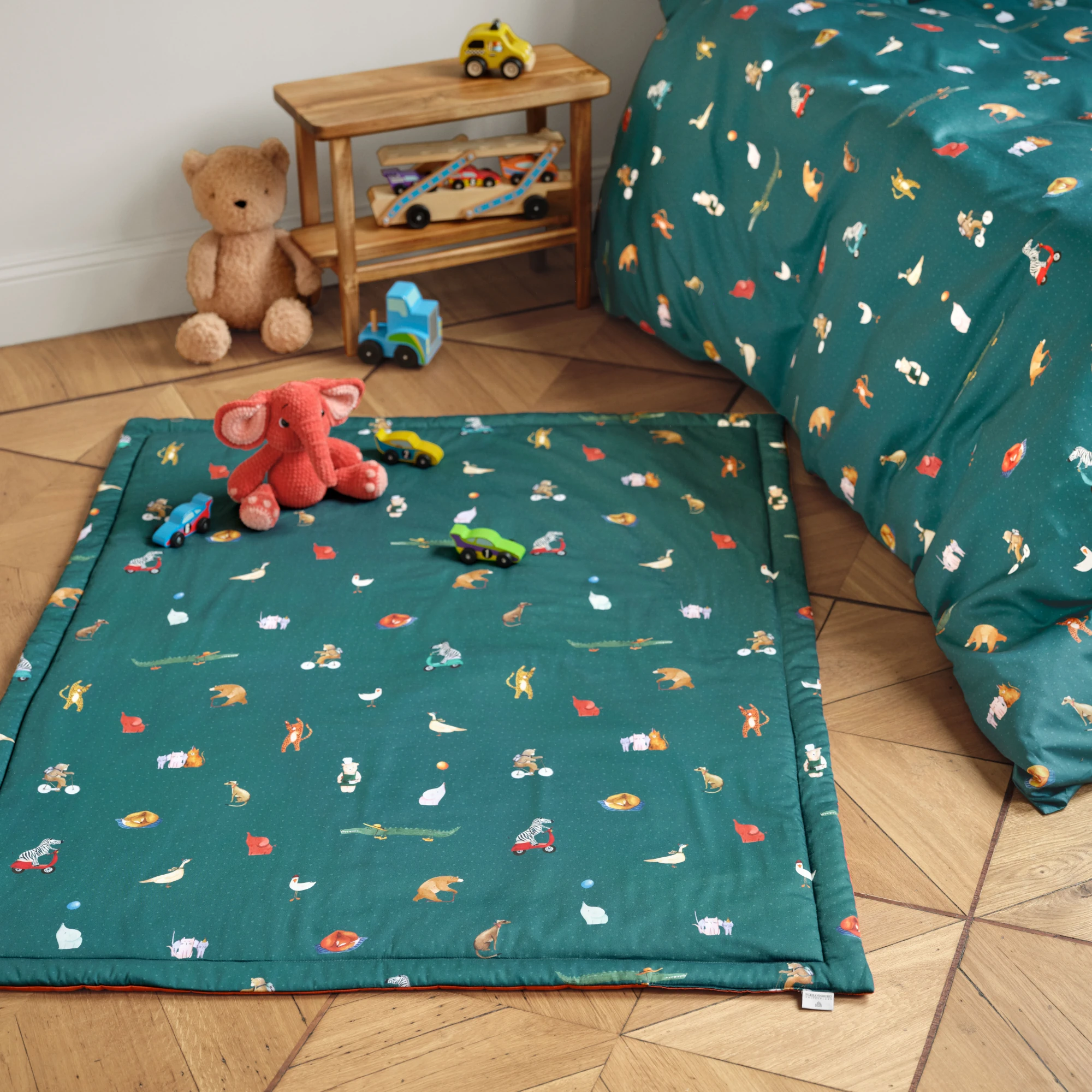 Die Baby-Krabbeldecke "Party Leo" greift die vielfältige Wildtierwelt des gleichnamigen Bettwäsche-Designs auf und lässt die kleinsten Entdecker alle tierischen Freunde auf petrolfarbenem Hintergrund wiederfinden, wohingegen die Unterseite von der stilvollen Unifarbe Cayenne geziert wird. Die Baby-Krabbeldecke hat zwischen den beiden Stoffen an Ober- und Unterseite eine babytaugliche Wattierung integriert und ist bei 40° C waschbar.