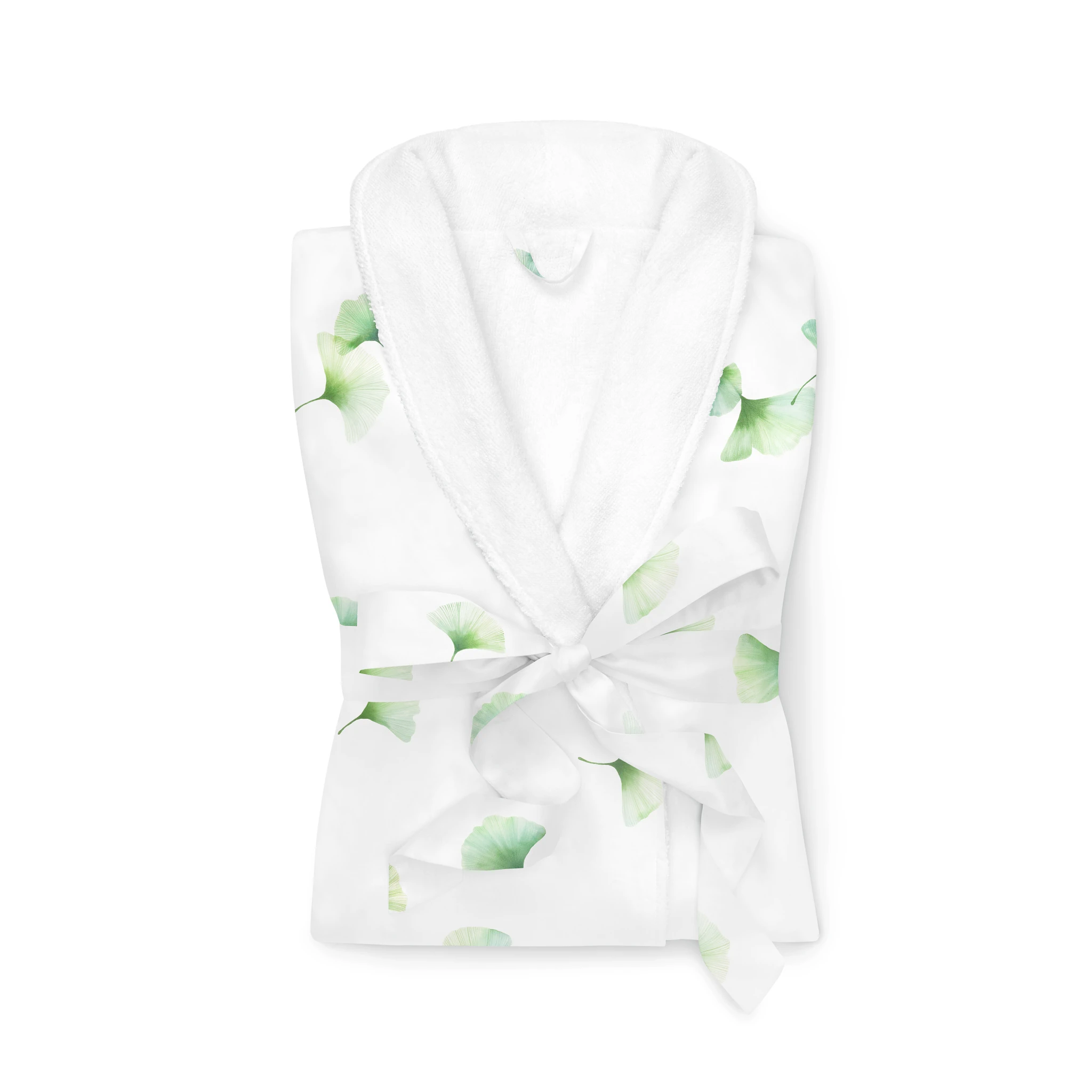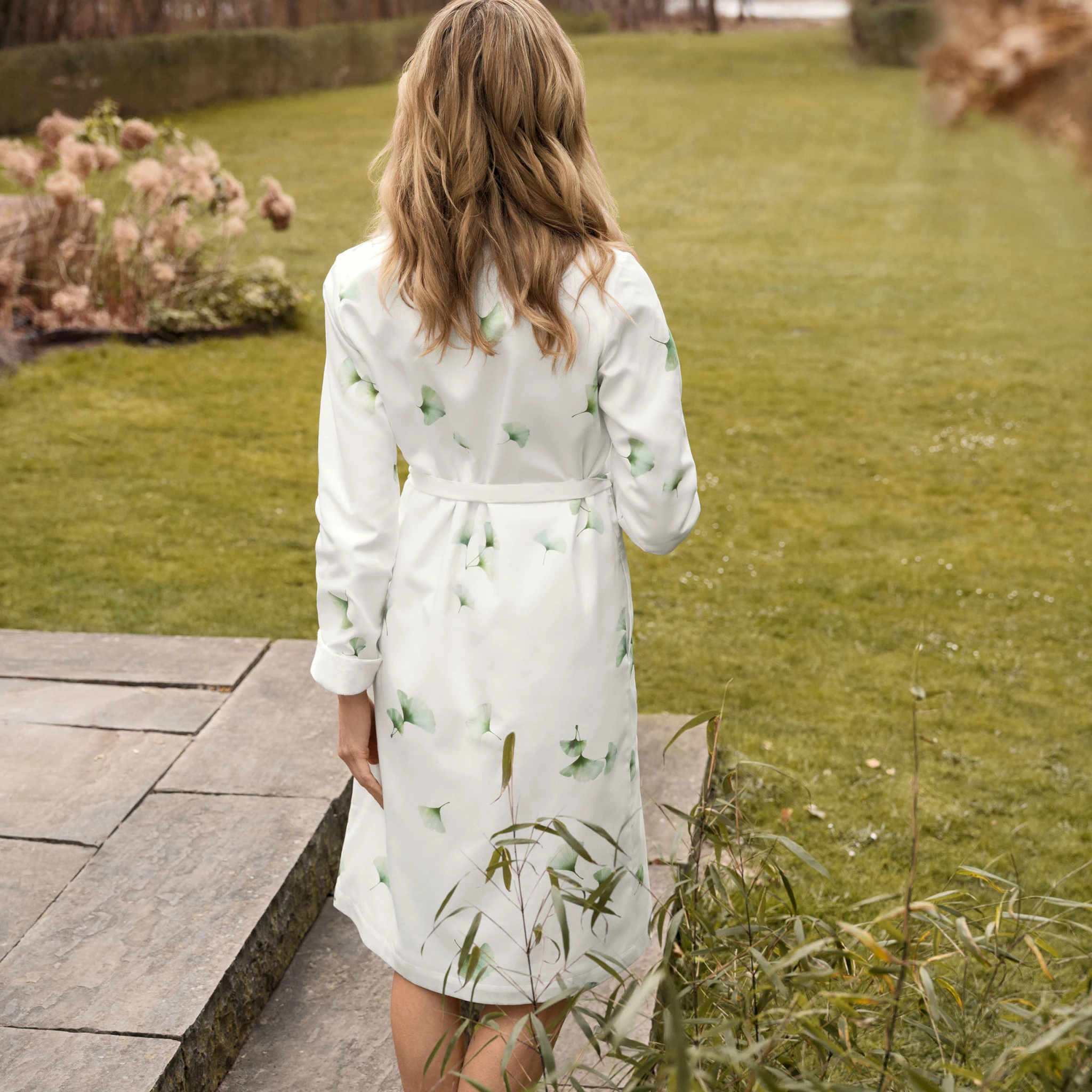 Auf dem Schlossberg Morgenmantel Aiko schweben feine Ginkgo-Blätter in sanft abgestuften Grüntönen über makellos weißen Satin – als würden sie von einer leichten Brise getragen. Die in Aquarell angelegte Darstellung sorgt für eine zarte Transparenz; weiche Farbverläufe und die filigranen Blattadern verleihen dem Motiv Tiefe und eine natürlich wirkende Leichtigkeit. Das zurückhaltende Design bringt eine ruhige, fast meditative Atmosphäre – inspiriert von der Stille eines Zen-Gartens.