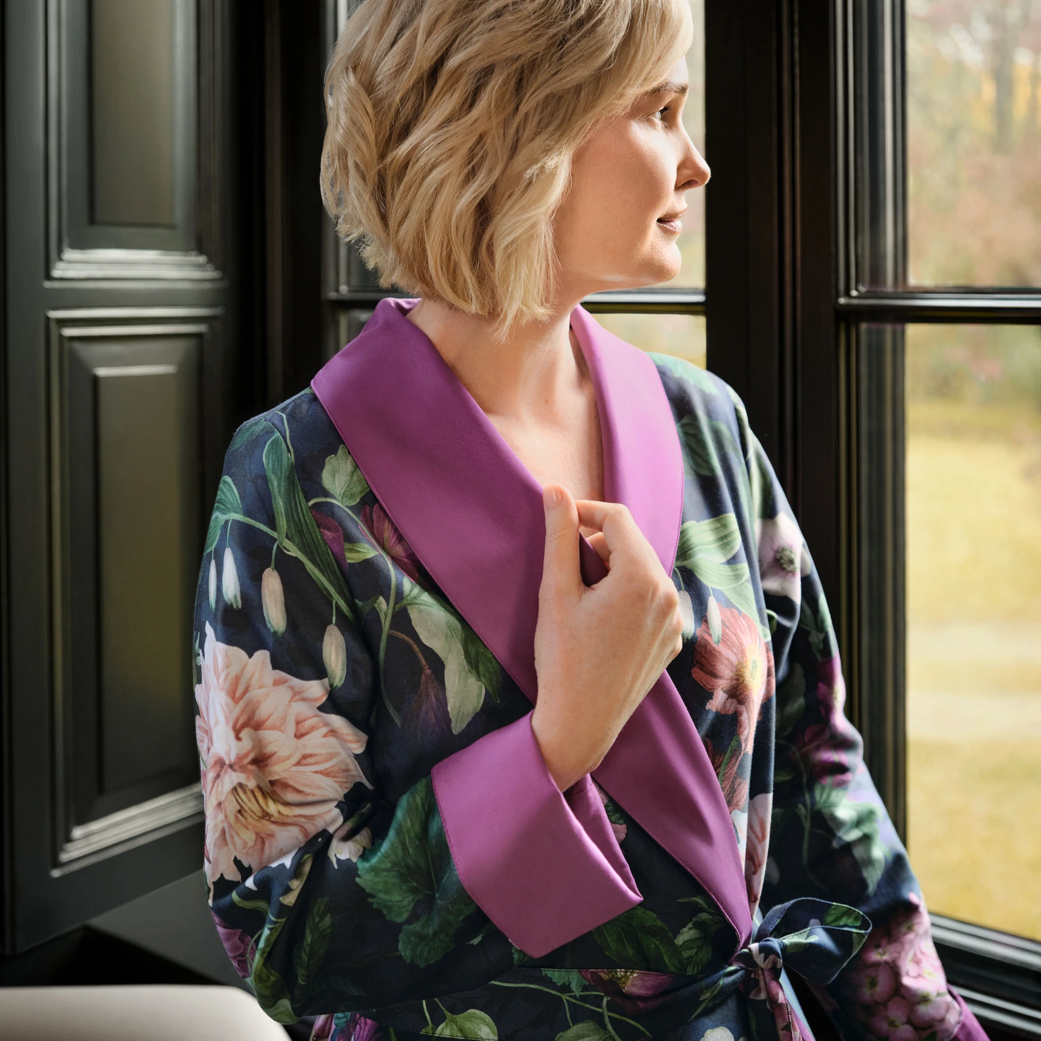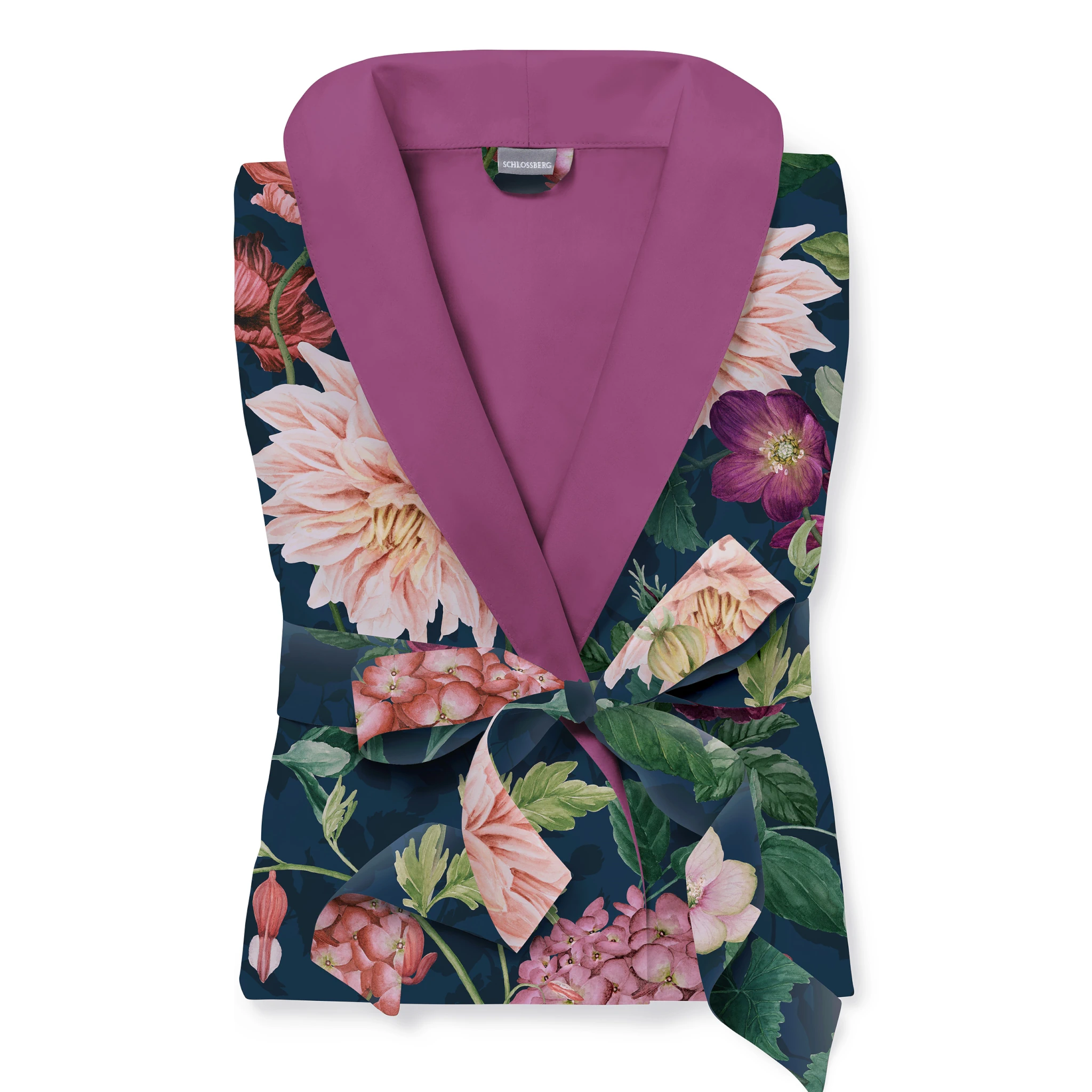 Das florale Muster in kräftigen Farben auf tiefblauem Hintergrund verleiht dem Mantel eine zeitlose Eleganz, während die kontrastierenden Details an Kragen und Ärmeln für einen stilvollen Akzent sorgen. Dank seines schmeichelnden Schnitts und des praktischen Bindegürtels passt sich der Morgenmantel perfekt der Silhouette an und sorgt für ein Höchstmaß an Komfort und Bewegungsfreiheit.