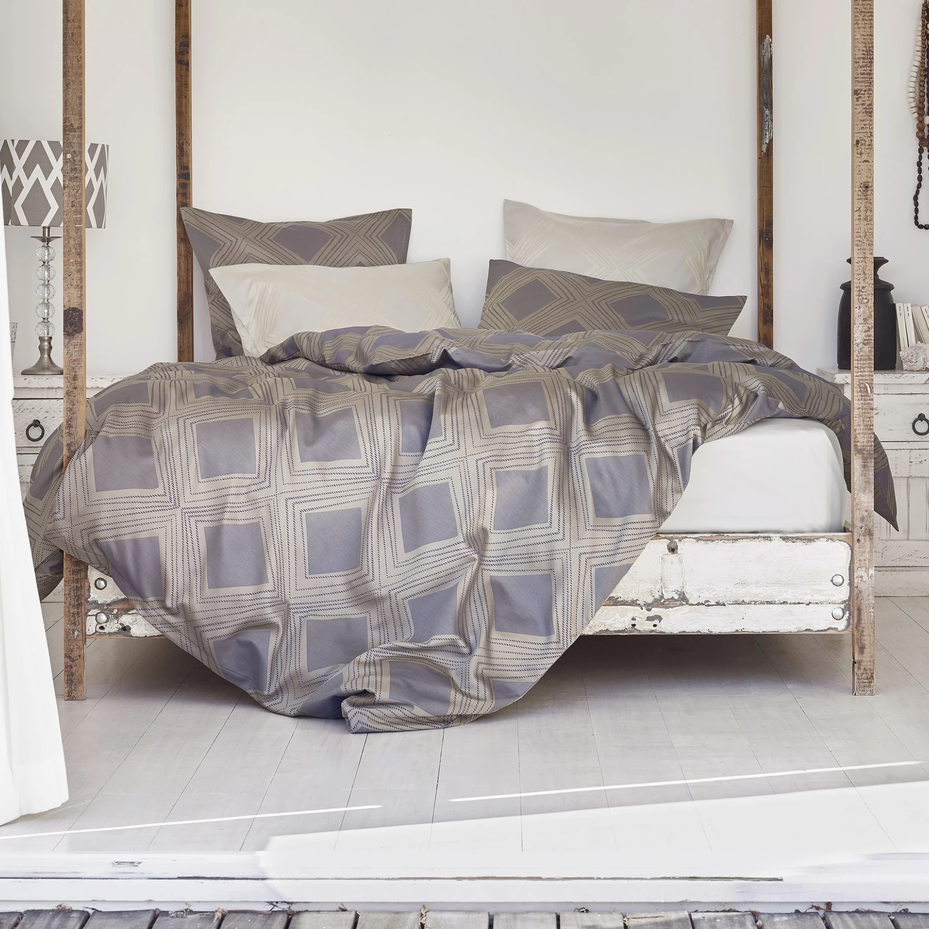 Die mehrfach ineinander stehenden Rauten der Zimmer + Rohde Bettwäsche "Modern Dance" reflektieren nicht einfach nur ein vielfach verwendetes Ornament. Das auf den Kopf gestellte Viereck zählt zu den ältesten von den Menschen genutzten Grundformen und symbolisiert als eines der Sinnbilder der Weltordnung einen begrenzten Raum, das Erdreich. Zugleich ist es das Zeichen für das Glück, das diesen Raum nie verlassen möge.