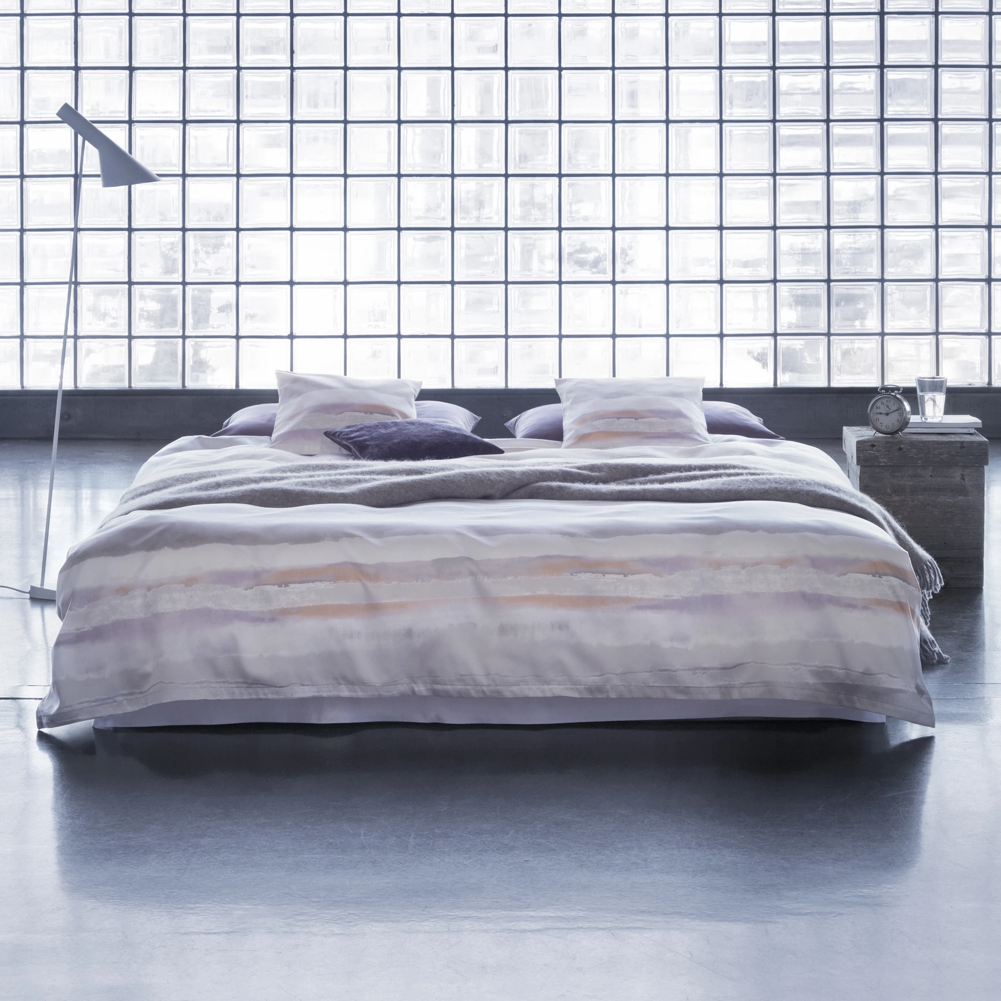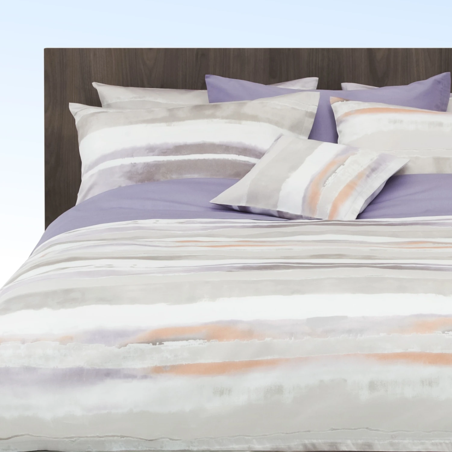 Die feinen Farbverläufe der Zimmer und Rohde Bettwäsche "Nobi" gleichen einem Aquarell. Die malerische Darstellung einer abstrakten Landschaft lässt der Fantasie freien Lauf. Das in den wärmeren Farbnuancen Rostorange und Lila gehaltene "Nobi" viola mutet wie ein Sonnenuntergang an.